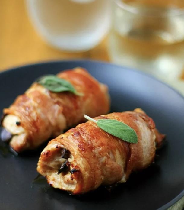 Рулетик из куриного филе в беконе с грушей